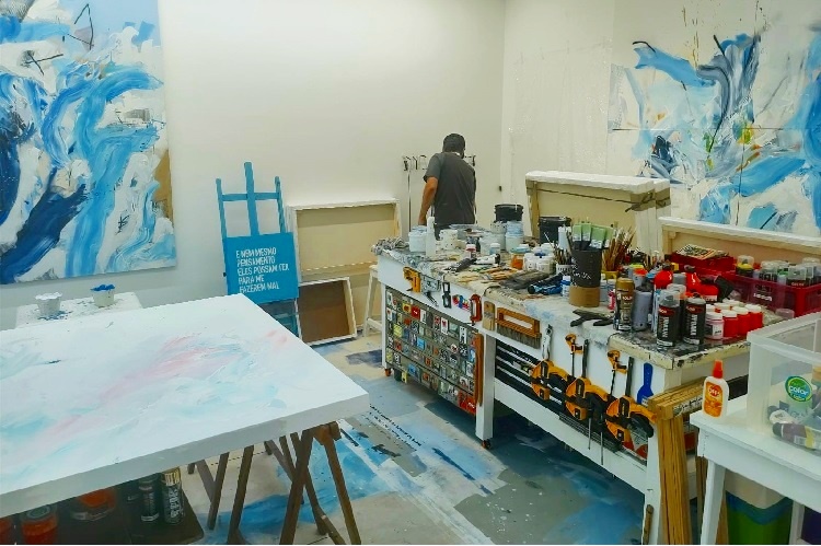 O artista Renê Machado em ação: atelier megaorganizado e produção que atravessa noites.